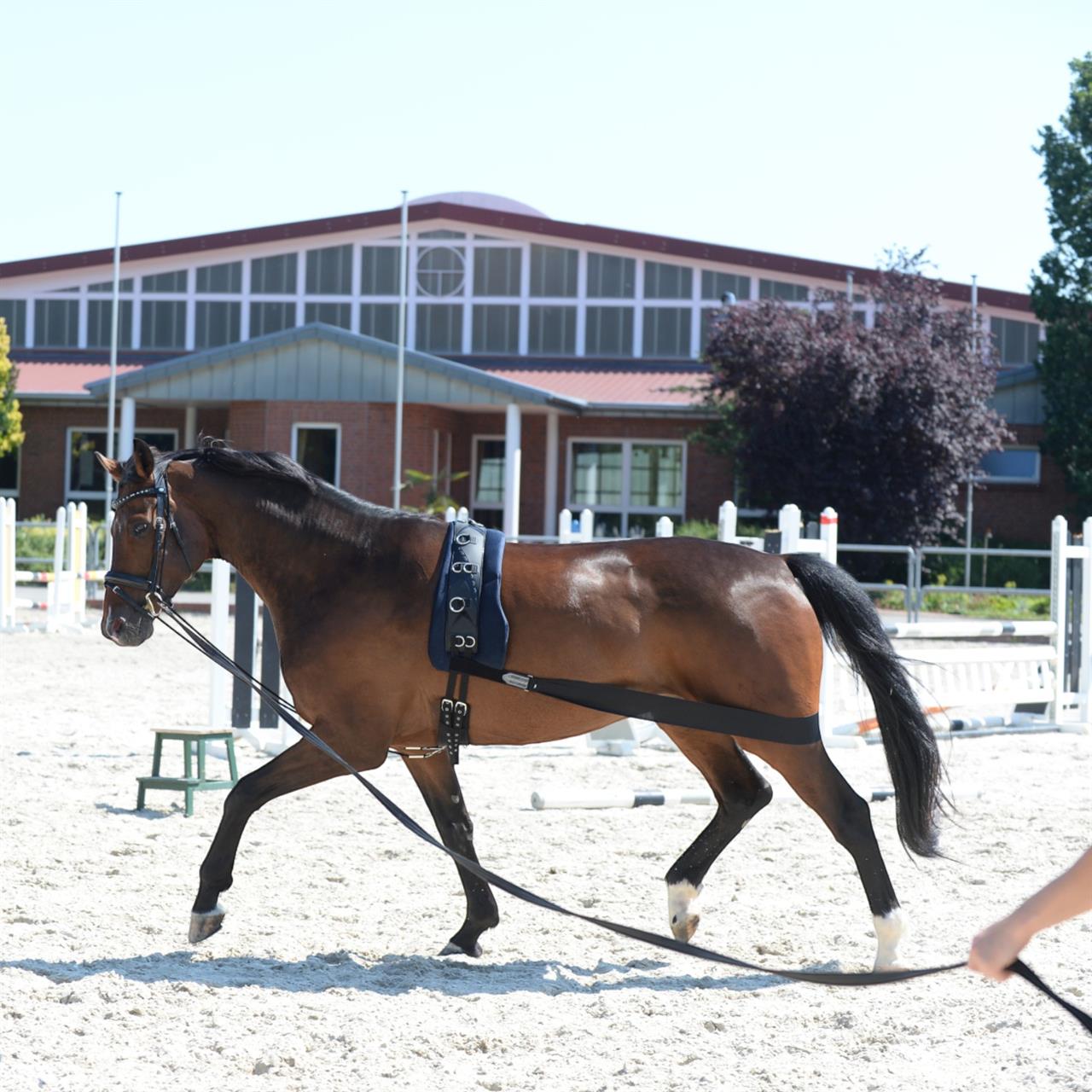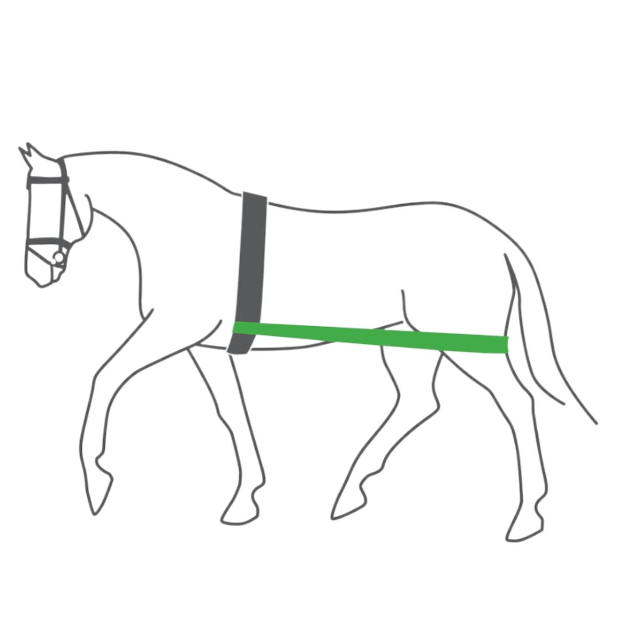 Die Körperbandage ist aus hoch-elastischem Material und ist mit zwei Klettverschlüssen leicht zu befestigen und zu verstellen. Sie aktiviert die Hinterhand des Pferdes, sodass ein besseres Abfußen unter dem Schwerpunkt unterstützt wird. Die Bandage kann beim Reiten oder Longieren verwendet werden.